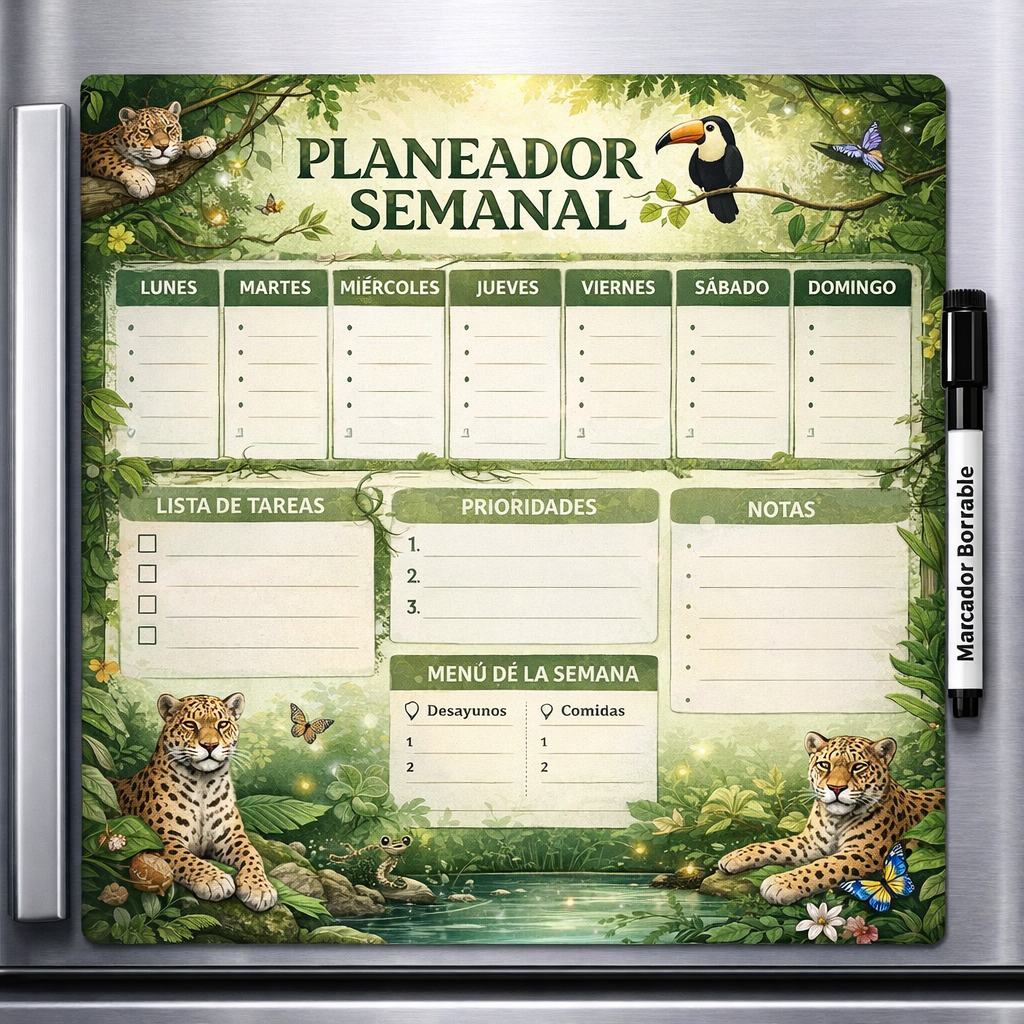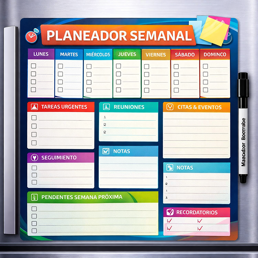 Dale un lugar real a tus metas con nuestro planeador imantado semanal, el organizador para nevera que mantiene tus tareas y pendientes siempre a la vista. Ideal para familias, niños y oficina, te permite escribir, borrar y reorganizar fácilmente, ayudándote a reducir olvidos y mantener el control de tu día. Porque cuando tus planes son visibles, cumplirlos se vuelve mucho más fácil.