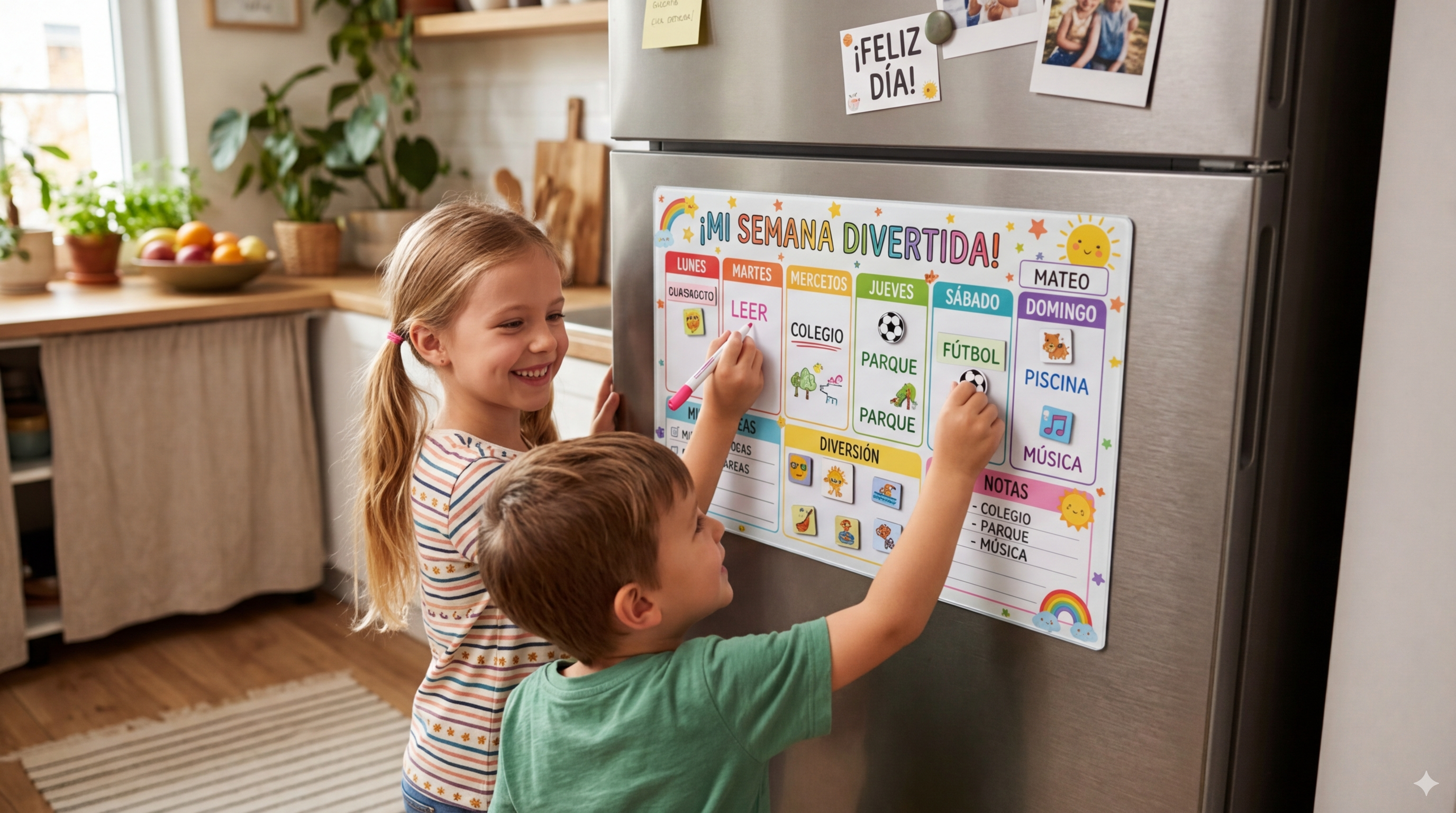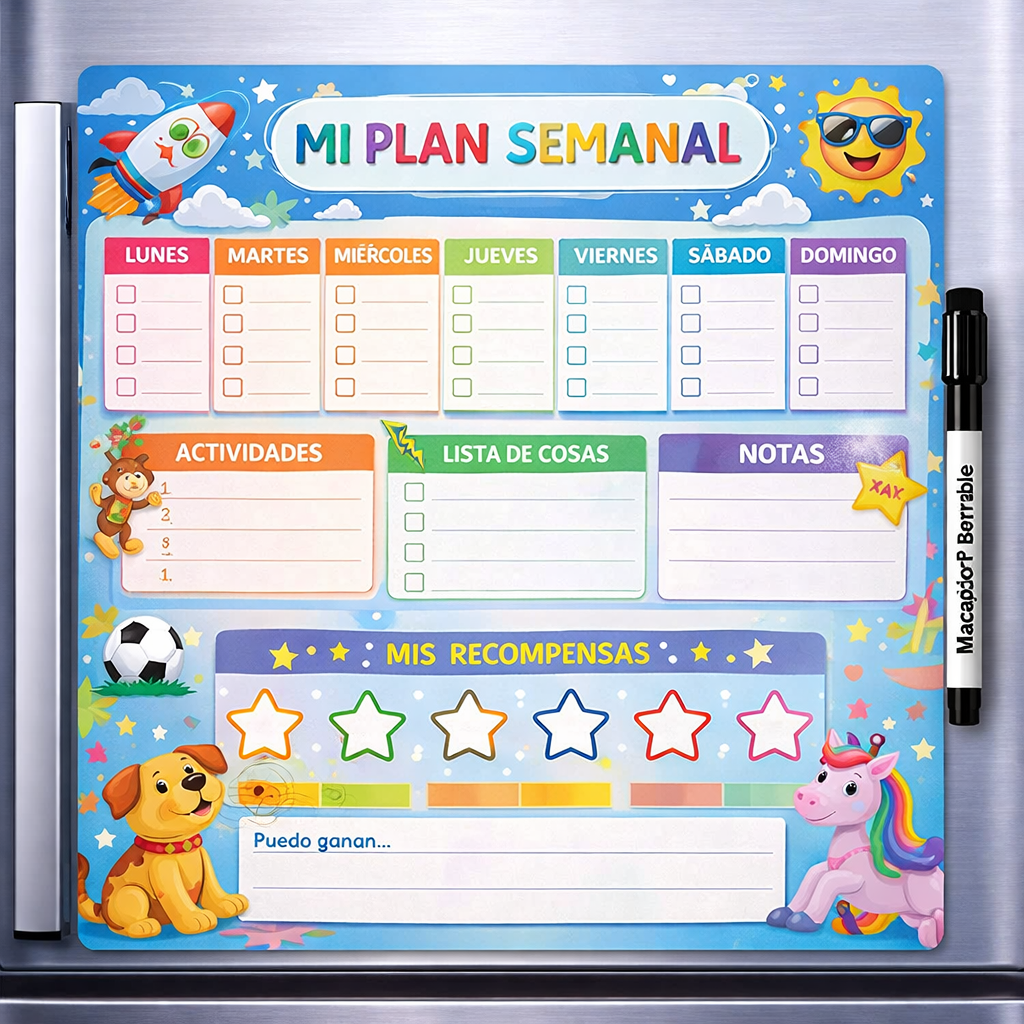 Tú eliges el diseño y nosotros lo hacemos realidad con nuestro planeador imantado personalizado, ideal para la nevera, la oficina o cualquier espacio. Perfecto para niños y toda la familia, te ayuda a organizar rutinas, tareas y pendientes de forma clara y práctica. Su superficie borrable permite escribir, borrar y volver a empezar sin manchar, y puedes complementarlo con un marcador imantado para tenerlo siempre a la mano.